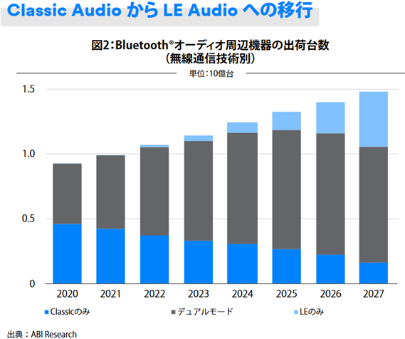 LE Audio は 20 年間の革新により、Bluetooth オーディオ性能を強化、補聴器サポートの追加、オーディオ体験とネットワーク接続方法を変える新しい Auracast のブロードキャストを導入するとある。