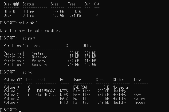 4. DISKPARTコマンドとDIRコマンドを駆使して、GPT変換対象のドライブ番号を調査・確認