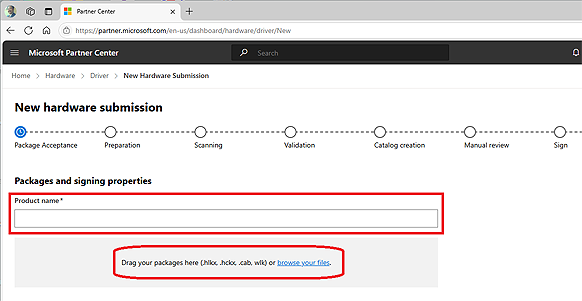 Submit new hardware をクリックしてEV証明書で署名した パッケージCABファイルを送信。