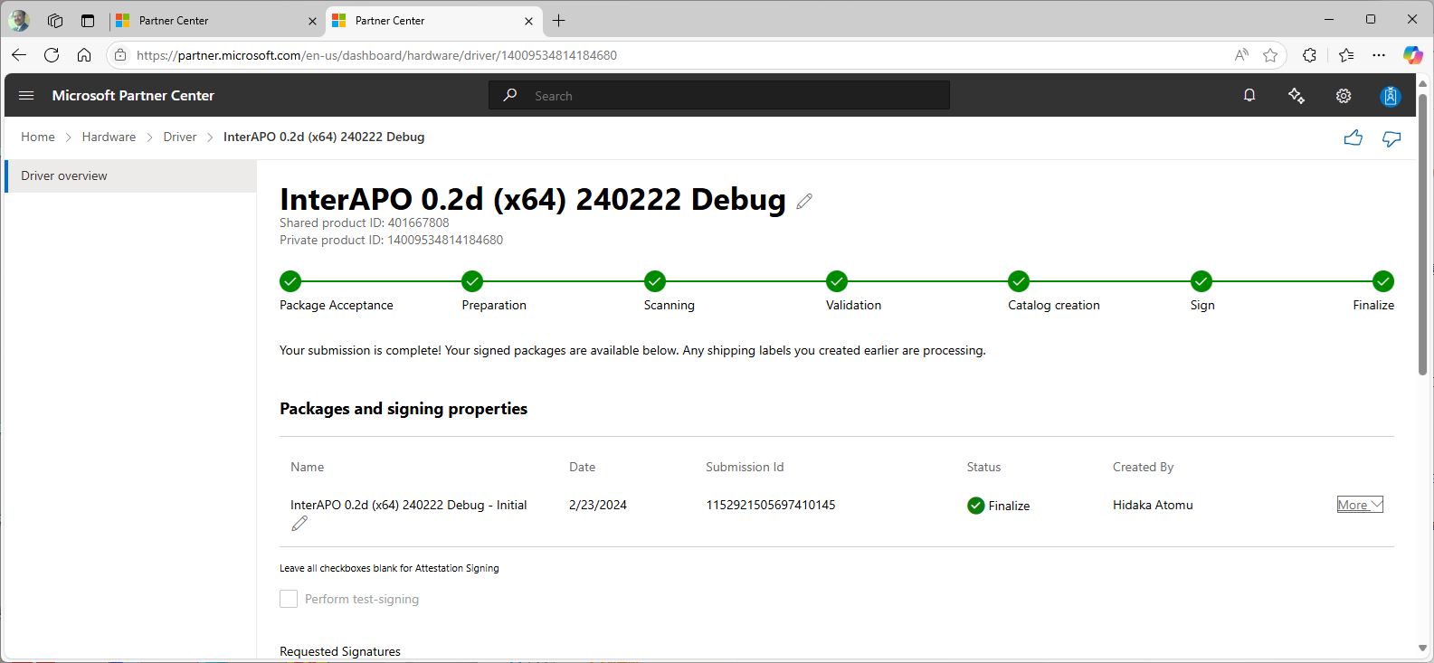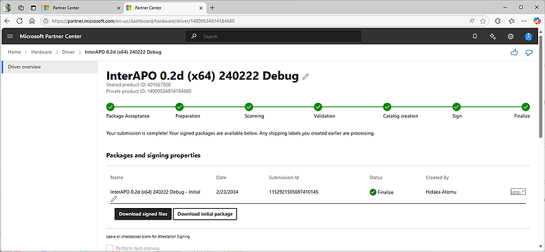 HLK テスト済み署名の申請は、Windows HLK Studio で可能で、Windows Hardware Lab Kit で解説されている。