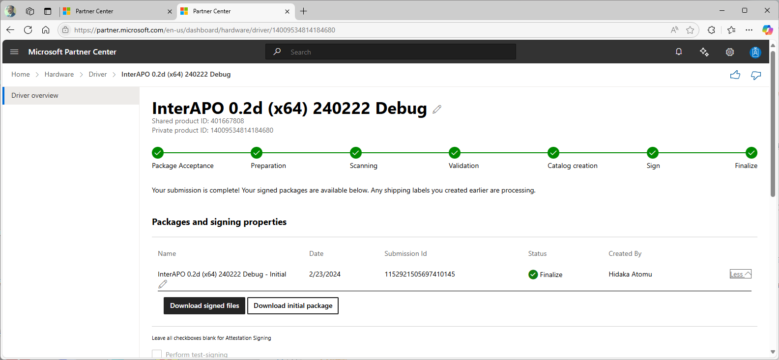 署名を貰った「Product Name」は永久にここのダッシュボード管理されるので、日付、バージョン、アーキテクチャといった情報を付加しておくべきである。