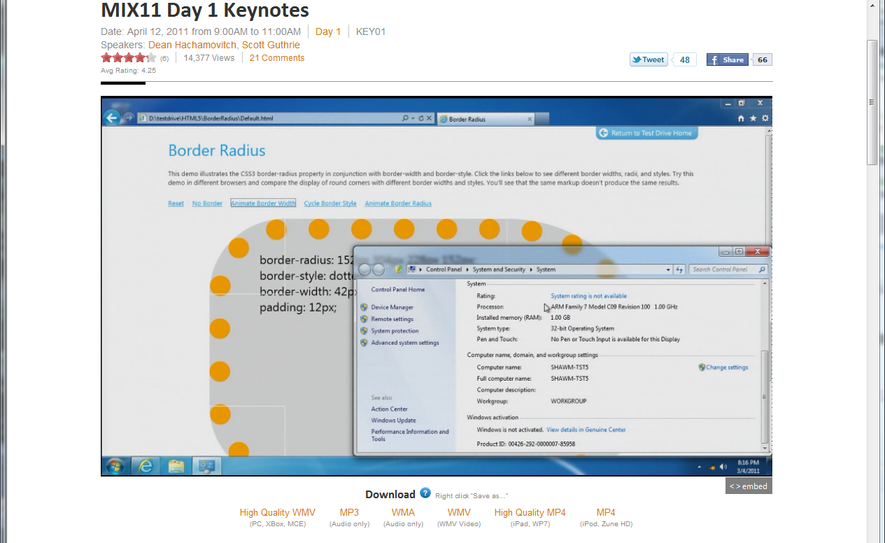 上記Keynote SessionのIE10/HTML5の解説途中で登場したSinofsky氏は、Google Chromeと比べてIE10でHTML5の描画性能がいかに良いのかという説明に割って入ったのだが「ところでこのIE10は実はARM Processorのマシンで動いているんだよね~。」とシステムのプロパティを広げて示した。丁度30分経過した辺りである。