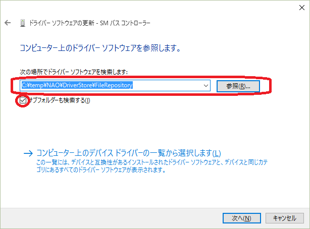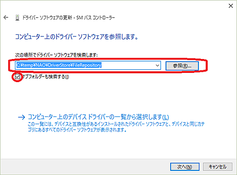 気を取り直してWindows 8.1の環境からバックアップしてある「FileRepository」を使用する。先ほどのダイアログでは最新版の検索ではなく、「コンピューターを参照してドライバーソフトウエアを検索します」の方を選択する。