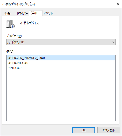 デバイスマネージャーから正常インストールされてない「デバイスのノード」を右クリックしてプロパティを開く。詳細タブを開いてプルダウンメニューで「ハードウェア ID」を選択すれば、見つからないというハードウェアの素性がわかる。この例では「ACPI INT33A0」がキーワードだか、これで検索すると不明なデバイスの正体(=探すべきドライバー)は「Intel Smart Connect」だと一発でわかる。