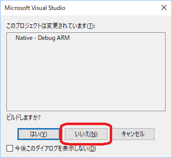 - 運よくビルドがエラー無しに終わったら、F5やデバッグをメニューから選択してデプロイができる。その際に次のダイアログが表示されるが、ここは必ず「いいえ」で答える。
