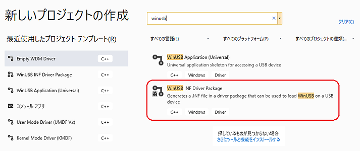 WinUSBで対応する場合は、対象デバイス用にWinUSBドライバーをどの様にしてインストールするかと言う課題がある。一般的なのは、INFドライバーパッケージを作成して対応することだ。INFのほかにセキュリティカタログ(.CATファイル)を作成して、それに構成証明書署名を付加する必要があるが、INFパッケージは次の様に Visual Studio のテンプレートを選択して容易に作成できる。構成証明書署名については 別記事 を参照されたい。
