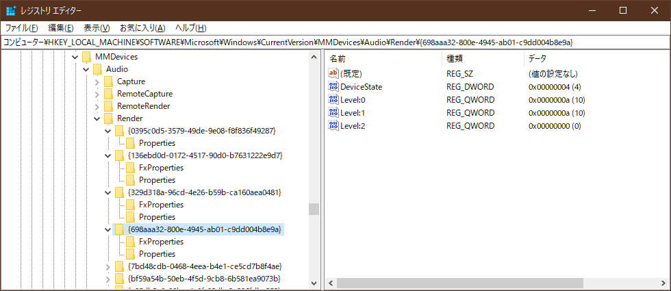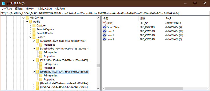 調べたところ、各種のインストールされている APOドライバー の個別パラメーターと優先順を管理するレジストリが変更されていた。