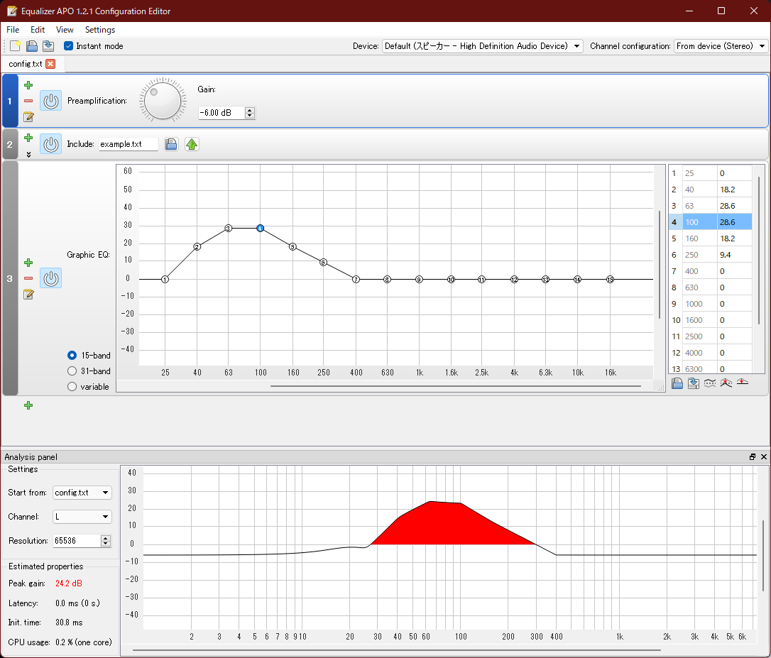 インストール後、再起動で利用可能だ。C:\Program Files\EqualizerAPO 以下の Editor.exe を起動して、15チャンネルグラフィックイコライザーを設定できる。