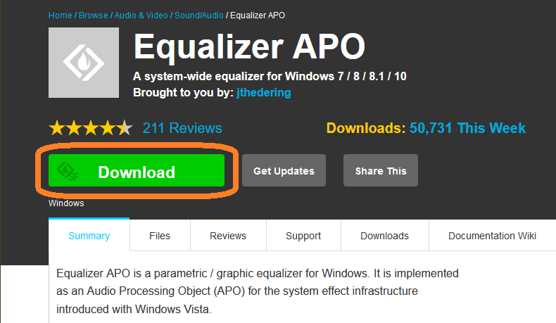 インストールは簡単で、以下の Equalizer APO のページで Download ボタンをクリックして、EqualizerAPO64-1.2.1.exe ファイルを入手、実行するだけである。