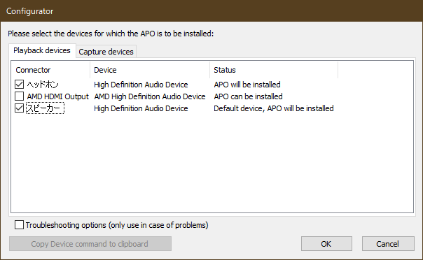 インストール時、次の様に Equalizer APO を適用する物理デバイスを選択する。後で変更可能だ。