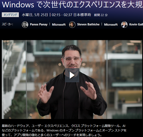 注目しているのは、Windows で次世代のエクスペリエンスを大規模に構築 のセッションだ。22分の比較的短い時間で、最新から今後半年以内に公開予定の技術や製品を詳細に紹介している。