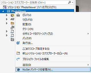 ソリューションエクスプローラーで開発対象のプロジェクトを右クリックして、NuGetパッケージの管理を選択する。