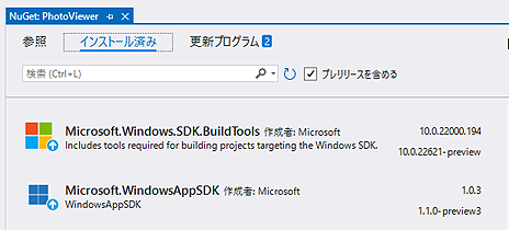 NuGetパッケージ管理の設定で、プレリリースを含めるをチェックすると、SDK.BuildToolsとWindowsAppSDKの項目が出現する。