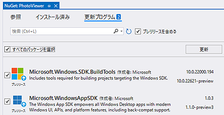 そのまま 更新プログラム タブに移動してすべてのパッケージを選択して更新をクリックすると、やっとWindows App SDK 1.1 (public preview) がインストールされる。
