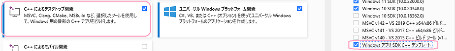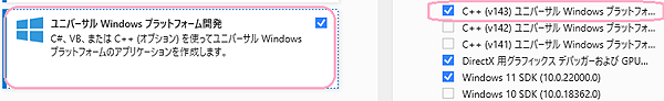 まずユニバーサル Windows プラットフォーム開発のワークロードを選択して、C++ (v143) ユニバーサル Windows プラットフォームを有効にする。