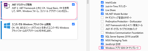 次に.NET デスクトップ開発のワークロードで、Windows アプリ SDK C# テンプレートを有効にする。