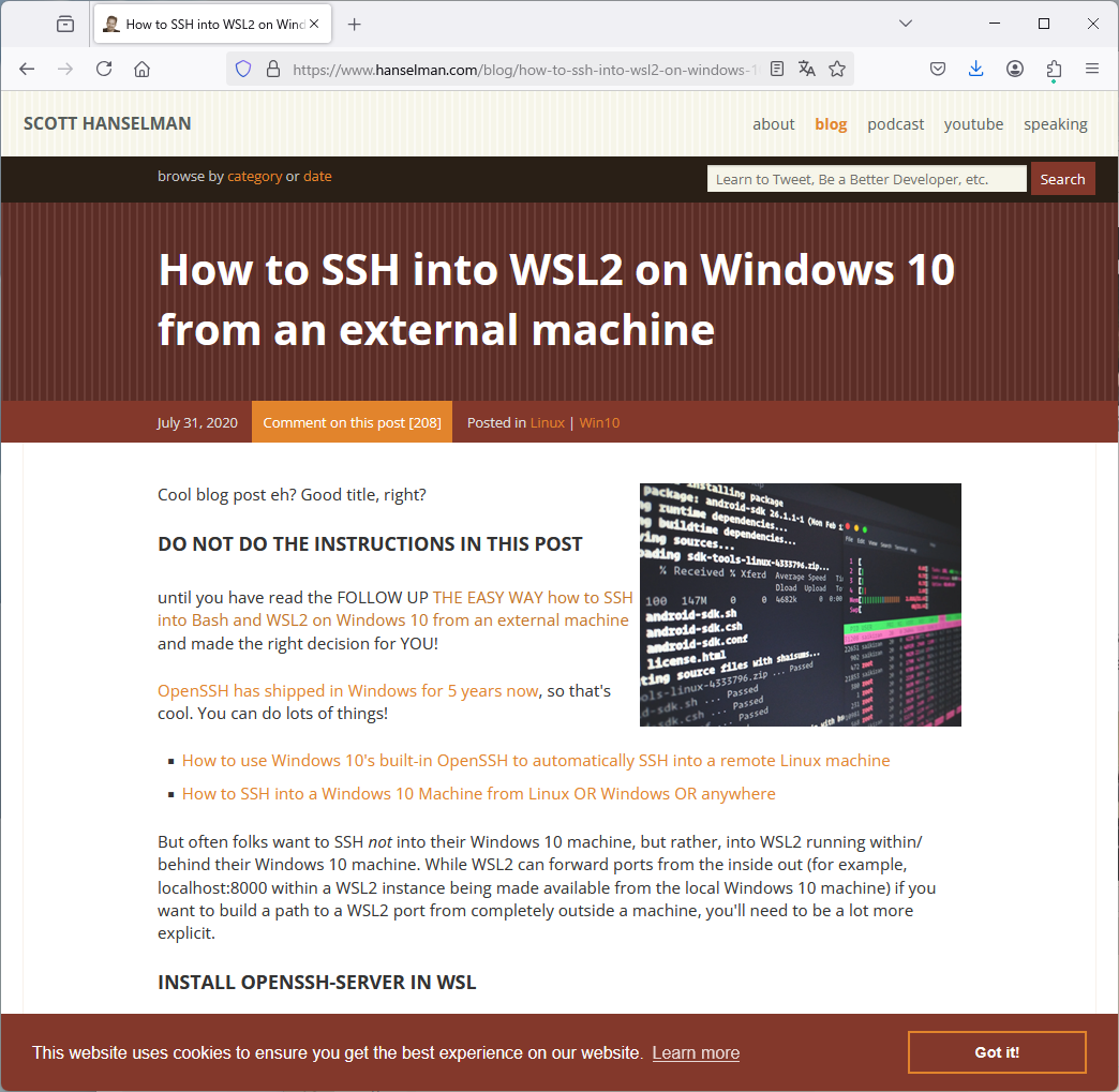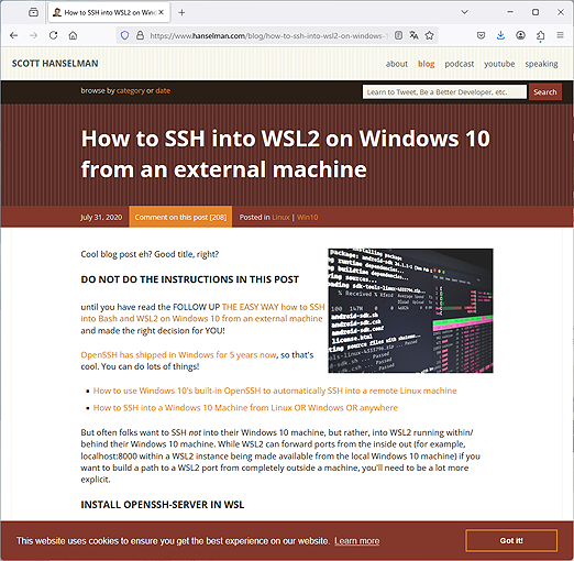 以下が Microsoft Build で最初に公開された Scott Hanselman 氏のブログである。1か月後に、より簡単な手順が公開されたときに「DO NOT DO THE INSTRUCTIONS」と修正されたが、手順が少し複雑なだけで、問題なく動作する。また日本語検索では、この方法に似た方法しか出て来ないし、そのうち一部は正常動作しない。まさに「DO NOT DO THE INSTRUCTIONS」の方法である。