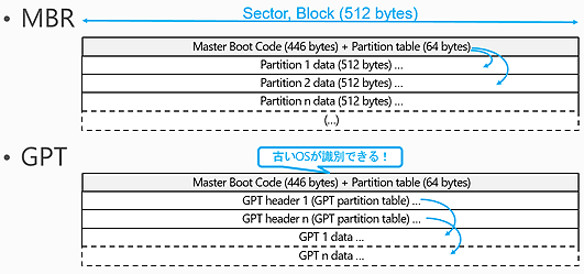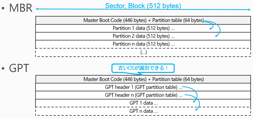 Windows が使用可能なパーティション形式は、1982年の PC-DOSで導入されたMBR(Master Boot Record)形式と、2005年にWindows XP x64で導入のGPT(Guid Partition Table)形式の2種類である。