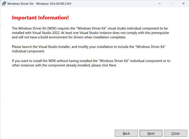 Windows Driver Kit の名目でオプション選択するこのコンポーネントを未インストールの環境に WDK をインストールしようとすると次の警告メッセージが出力されて、WDK インストールが失敗する。