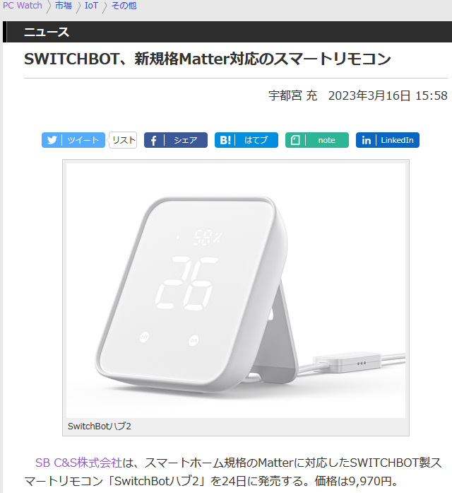 このPC Watch 記事 によると、C&S株式会社 は、スマートホーム規格のMatterに対応したSWITCHBOT製スマートリモコン「SwitchBotハブ2」を24日に発売する。価格は9,970円。 とある。しかもこれを機会に日本では、中国製のMATTER SwitchBotをSoftBankが売るということだ。